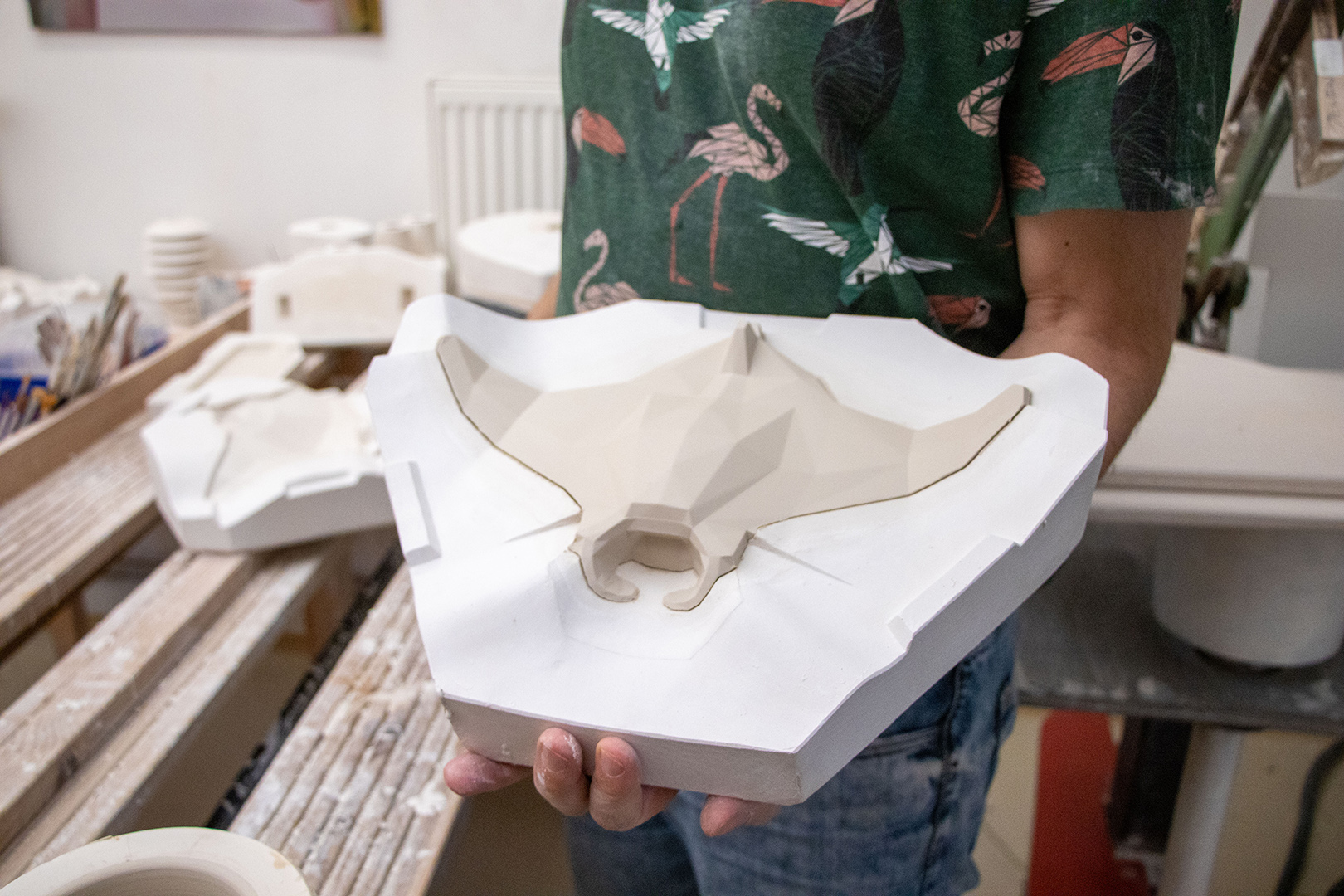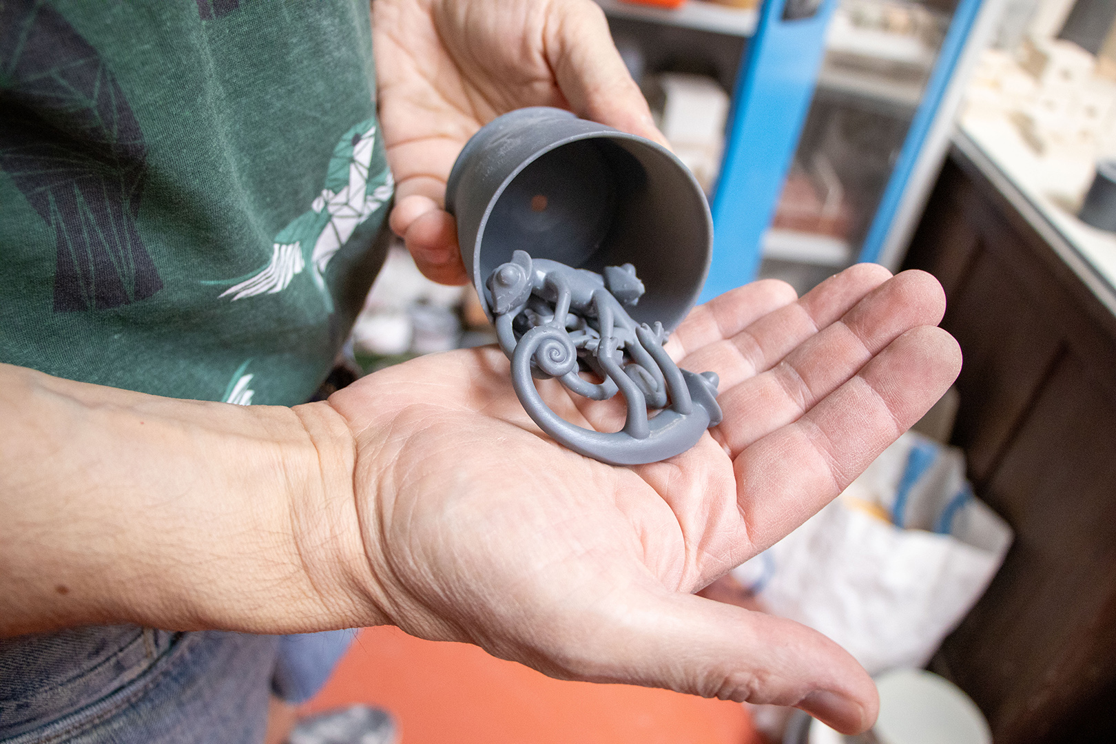 Jiří Hlušička také vyzdvihuje možnosti materiálů, které pro výrobu porcelánu znamenají větší svobodu designu. „Je zásadní, aby byl produkt vyroben z jednoho kusu. Jakékoli dělení by bylo vidět, což by znehodnotilo reliéf,“ vysvětluje. Široké portfolio průmyslových pryskyřic přitom nabízí odolnost materiálů i různé úrovně pružnosti, díky čemuž mohou vznikat komplexní modely. Aby byly prototypy dokonale vyčištěné, používají v porcelánce také čisticí stanici Form Wash. Tyto modely jsou připraveny na následné vyrobení sádrových forem, které se používají pro odlévání porcelánu.